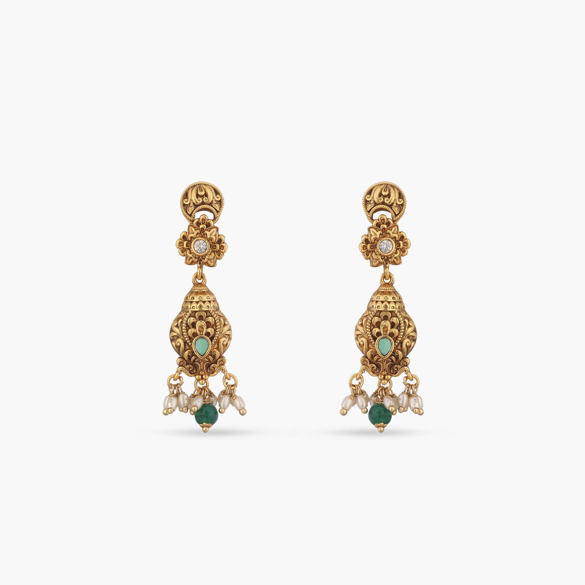 The Mihika antique drop earrings reflect exquisite craftsmanship, designed for women who love timeless elegance. Adorned with white and green stones and finished in antique gold plating, they bring a graceful touch of tradition to any ensemble.