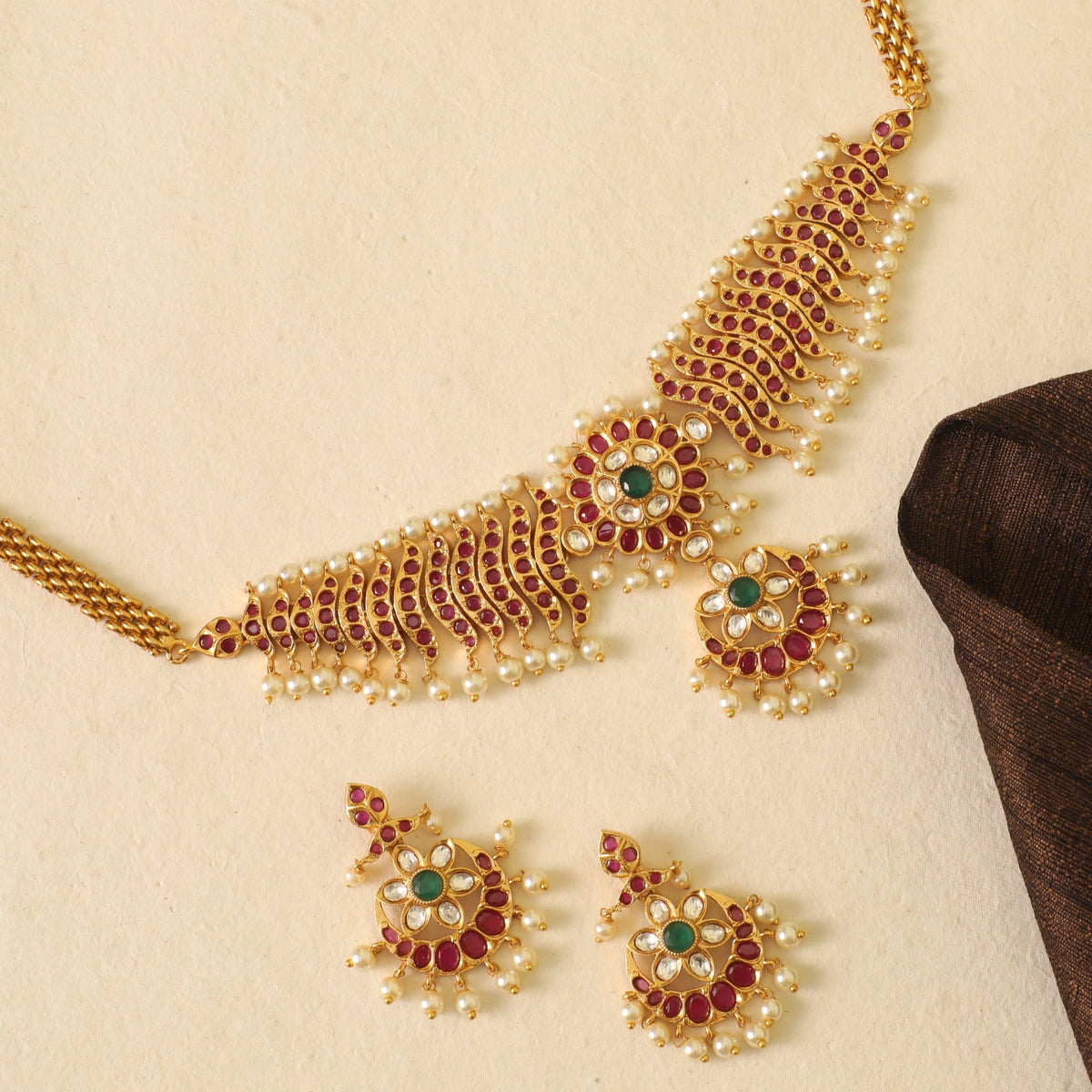 The individual elements of this choker necklace set are all enough to stand alone, yet they combine to form a combination that is not at all overpowering and simply graceful.