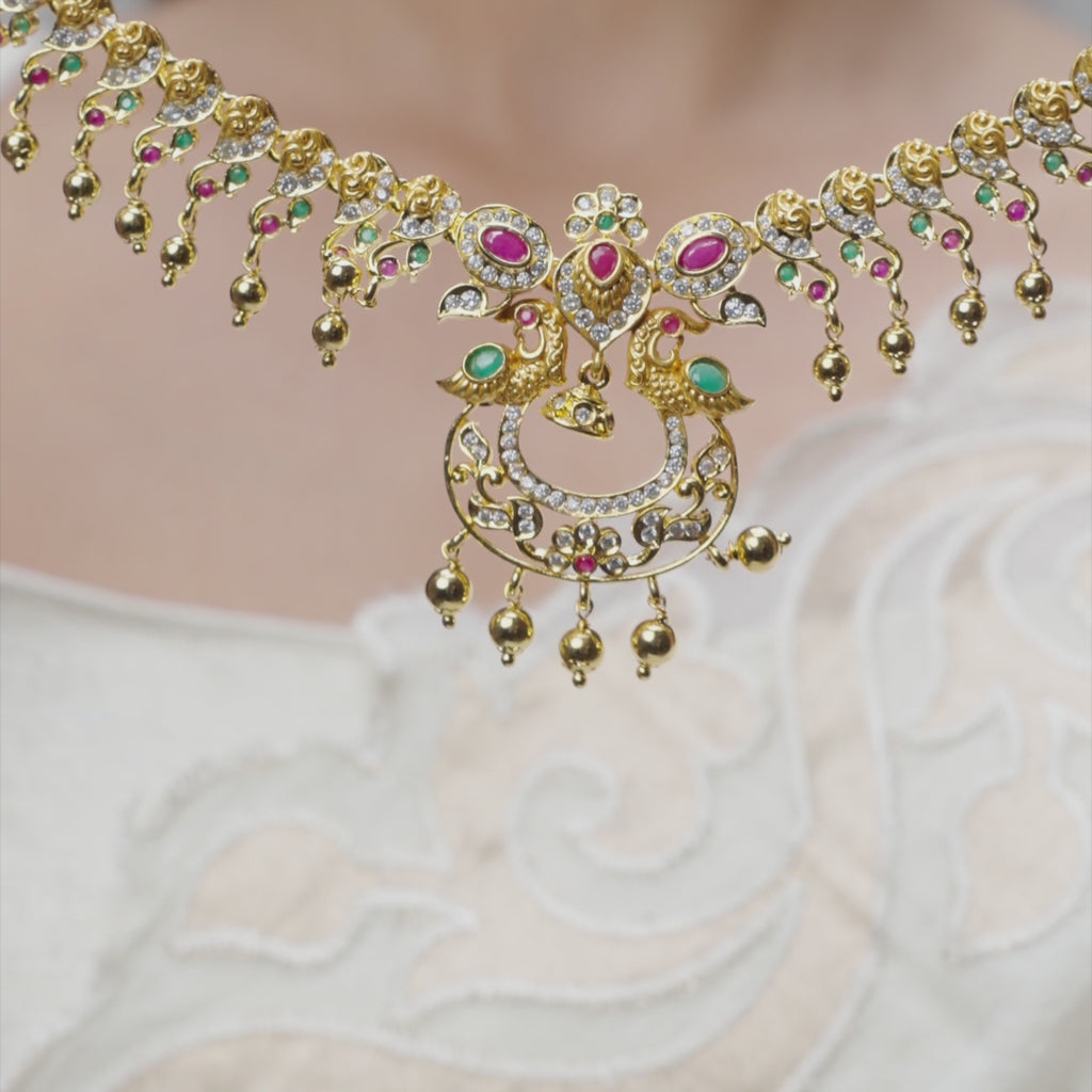 This is a different variation of our very popular Anu necklace set. The well-coordinated chain type and the centerpiece of this necklace set is its foundation. The high-quality stones give it a shine that is unmatched.