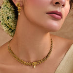 A heritage-inspired short necklace set highlighted by a brilliant red centre stone. Its antique finish and timeless design make it perfect for weddings, cultural events, and festive gatherings. Elegant and versatile, this piece brings a regal aura to every traditional outfit.