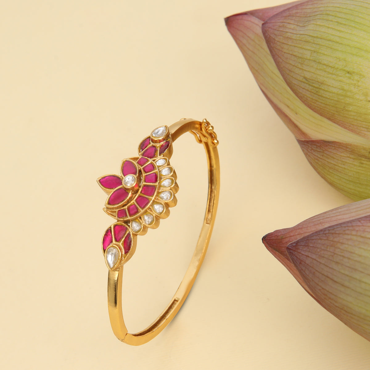The Ishya Antique Bracelet is beautifully crafted in antique gold plating, adorned with white, red, and green kempu stones. Designed with an elegant flower motif, this bracelet combines timeless craftsmanship with delicate charm, making it a perfect pick for festive occasions and everyday elegance.